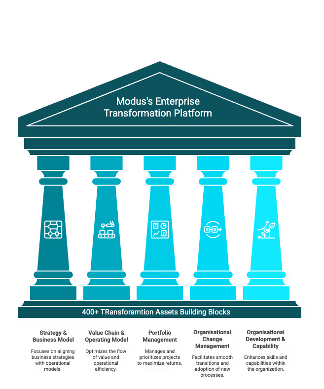 Modus brings one of the world’s first fully integrated Enterprise Transformation offering—unifying strategic design, operational intelligence, and generative AI—through three seamlessly connected pillars: